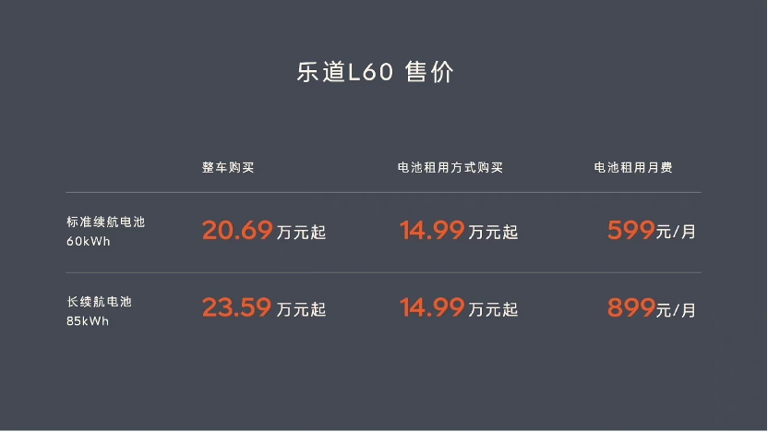 9月19日晚,蔚來全新品牌樂道L60正式上市,電池租用價14.99萬起,(60kWh電池599元/月,85kWh電池899元/月);電池買斷價20.69萬元-23.59萬元起,9月28日全國開啟交付。